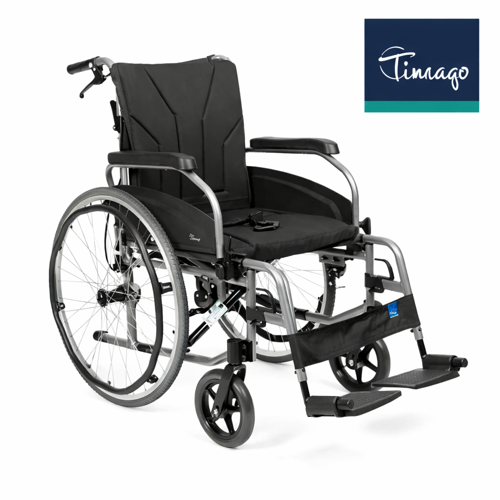 SIMPLE TIM letvægtskørestol er fremstillet med en stærk aluminiumramme, som kombinerer lav vægt med god stabilitet. Det ergonomiske sæde giver en behagelig siddestilling, mens de aftagelige fodstøtter gør det lettere at komme ind og ud af stolen. De stabile hjul sikrer en jævn og kontrolleret kørsel på almindelige underlag.